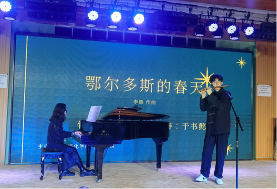 李泉呈老师带来的竹笛曲《鄂尔多斯的春天》,以清脆悦耳的笛声生动地描绘出鄂尔多斯草原上牧民们载歌载舞的热闹景象。