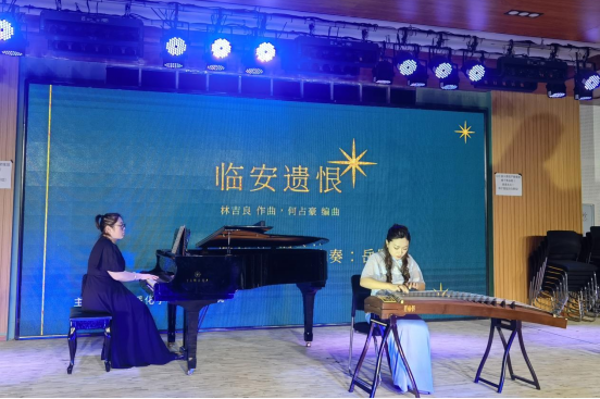 “弦音袅袅,雅韵悠长”,音乐沙龙在高佳元老师的古筝演奏中拉开序幕。古筝曲《临安遗恨》旋律悠扬婉转,如泣如诉,将听众带回到金戈铁马的历史岁月中;紧接着曲风一转,《战台风》激昂澎湃的旋律生动地描绘了台风肆虐时的惊险场景,展现了顽强不屈的抗争精神。