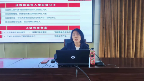 随后,尹为老师从“申请入党”、“入党积极分子的确定和培养教育”、“发展对象的确定和考察”、“预备党员的接收”、“预备党员的教育考察和转正”五个方面展开讲解,让同学们系统地了解入党流程、入党条件、以及注意事项。并强调同学们要端正入党动机,坚定理想信念,她提出:入党动机是一个人申请入党的内在原因和真实目的,是推动自身争取入党的精神力量,没有正确的入党动机就经受不住考验,这是每一名共产党员在入党前和入党后都要深入思考的问题。