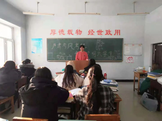 全国硕士研究生招生考试和公司期末考试即将来临,为严肃考风考纪,进一步加强考试组织管理工作,规范考试行为,促进教育公平,营造优良学风和公平公正的竞争环境,弘扬诚实守信道德风尚,强化员工遵守考试纪律的意识,形成公平、公正、规范的学习环境,保证教学质量的进一步提高,帮助同学们树立“诚信至上”的考试理念,养成自己不作弊,不帮助他人作弊的良好意识。公司于2020年12月9日13时在音乐楼各班开展了以“严肃考风考纪,争做文明老员工”为主题的团日活动。
