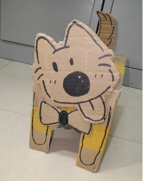 “这个纸质小狗是用废旧的快递盒制作的,经过简单的裁剪一个小狗就出来了,非常可爱,观赏性非常好,为我们的宿舍增添一份生机。”