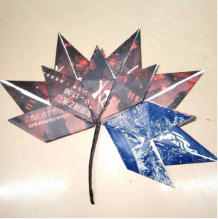 “图中的枫叶是用奶茶袋子制作而成,把奶茶袋子制作成手工艺品发挥了其作用,枫叶是秋天的代表,枫叶在秋风中舞动,如同精灵的翅膀,闪烁着温暖的光芒。”