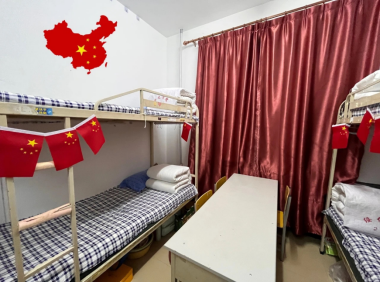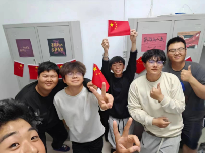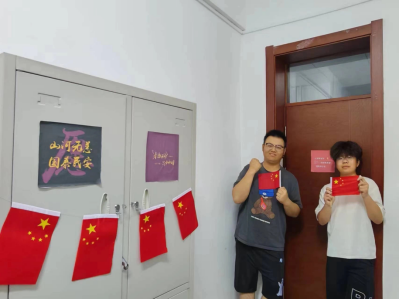 公司十公寓104寝室的同学们,将一面面红旗挂在柜子上,用红色元素装扮寝室,还将“山河无恙,国泰民安”、“清澈的爱,只为中国”等标语贴在柜门上,体现了同学们的爱国主义情感。同时,他们手持红旗,展现出对祖国的无限热爱与激情。