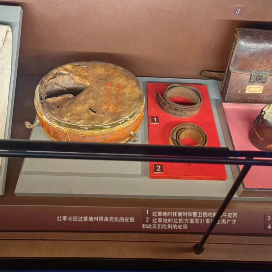 展厅中陈列着是红军过雪山的展品:只有一层的布料的御寒棉衣,过草地时用来充饥的皮鼓,吃剩的牛皮带,这些都展现了战士们为了中国共产党的胜利坚持不懈,坚定革命的理想和信念,他们不怕任何艰难险阻,救国家于危难之间,这些展品也让在场所有人更加深刻的了解了中华民族伟大长征精神。