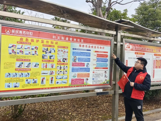 居民健康意识的提升至关重要,因此龙涵睿同学在社区广场开展了卫生安全常识普及活动。他发现社区自带的展板内容丰富,涵盖常见应急急救措施、传染病预防等知识,便以此为基础,开始充分准备讲词。